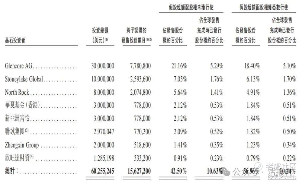 本次发行以机制B分配,公开发售占10%,无强制回拨。国配引入8家基石投资者(Glencore AG、Stoneylake Global、North Rock、华夏基金(香港)、新亚洲富怡、联域集团、Zhengxin Group、欣旺达财资),认购约6千万美元,占全球发售股份的42.50%。