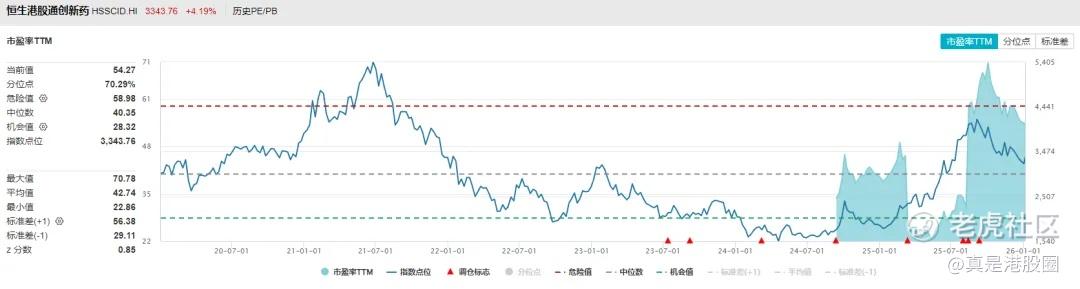 从下图中看,恒生港股通创新药的分位数在70%,目前的静态估值相较2025年9月份时便宜了不少,指数的静态估值情况也没有达到21年的顶峰水平。