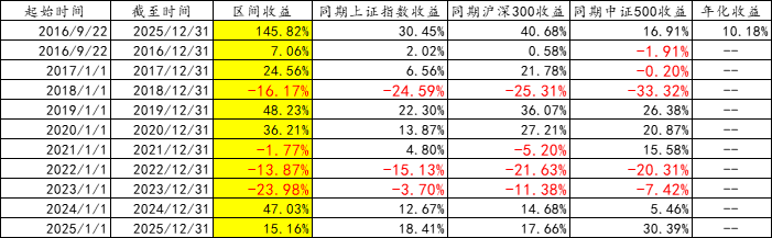 从2016年9月22日,截止到2025年12月31日,收益率为145.82%,按复利算,年化收益率为10.18%。