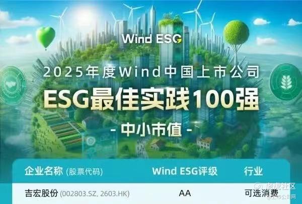 国内权威ESG评级机构 Wind ESG重磅发布了“2025年度Wind中国上市公司ESG最佳实践100强”榜单,吉宏股份从众多上市公司中脱颖而出,荣登“2025年度Wind中国上市公司ESG最佳实践100强(中小市值)”榜单!