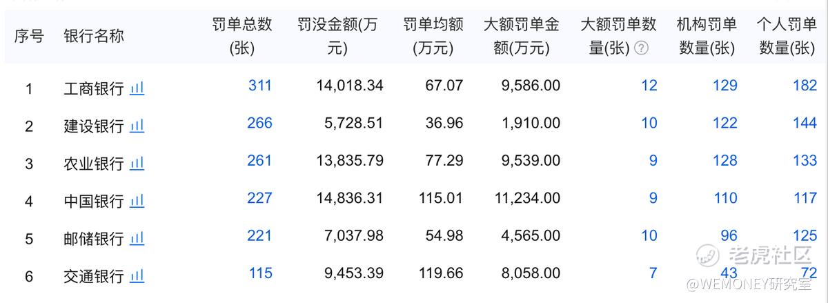 而从罚单总金额来看,中国银行排名第一,其次为工商银行和农业银行,罚单总金额分别为14836.31万元、14018.34万元和13835.79万元。