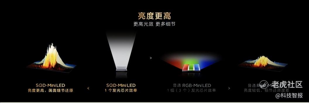 控光分区作为Mini LED技术的核心,直接决定画面对比度与纯净度。SQD-Mini LED将“一灯一分区”优势发挥到极致,而RGB-Mini LED至少需三颗灯珠才能组成一个有效控光分区。这意味着,同等芯片数量与成本下,SQD-Mini LED的物理控光分区数量理论上可达RGB-Mini LED的3倍以上。结合超聚光微透镜、微距OD技术及自研光影算法,SQD-Mini LED实现“一区顶多区”的控光精度飞跃,在对比度上形成代差级优势,让暗场更纯粹、亮场更通透。显然,SQD-Mini LED并非简单技术迭代,而是对RGB-Mini LED在光学原理、结构设计与画质表现上的系统性超越。