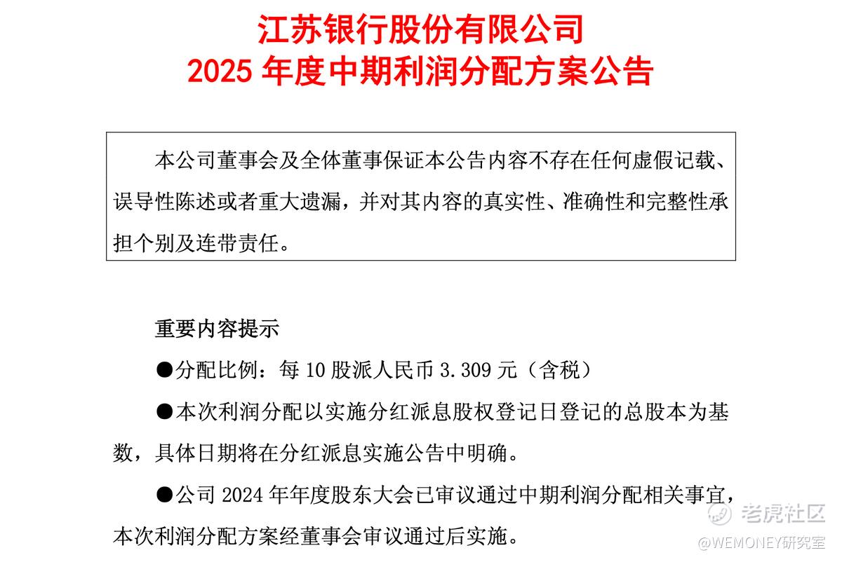 1月4日,江苏银行(600919.SH)发布公告称,拟每10股派3.309元,以总股本18,351,324,463股计算,合计分配60.72亿元(含税),占 2025年半年度归母净利润的30%。