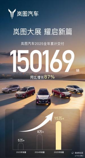 2026年的第一天,岚图汽车率先发布年度成绩单:2025年全年交付150,169辆,同比增长高达87%,连年攀升,发展势头强劲。在新能源汽车市场竞争趋于白热化、价格战频发,车企利润空间进一步被压缩、企业经营难度进一步加大的当下,岚图汽车的这份成绩单显得格外亮眼,进一步夯实了“央国企高端新能源第一品牌”的地位。