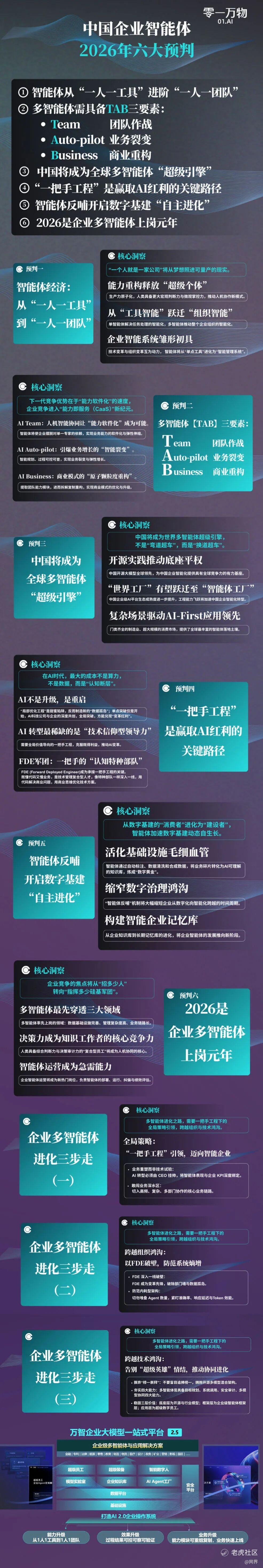 基于技术探索与头部客户AI变革实践,零一万物明确了2026年中国企业智能体六大核心预判,并配套推出“三步走”落地计划,同时结合中国开源优势与广阔场景,预判中国将成为全球多智能体超级引擎。