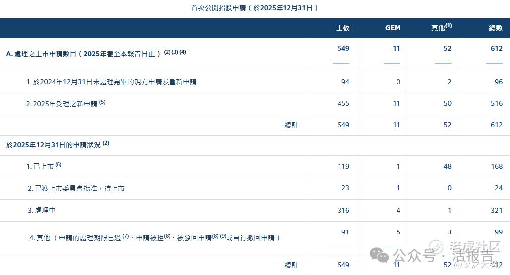 据港交所数据,截至12月底,2025年全年港交所处理的主板及GEM上市申请达560宗,其中已上市120宗,已获批待上市的有24宗,仍在排队处理的还有320宗。