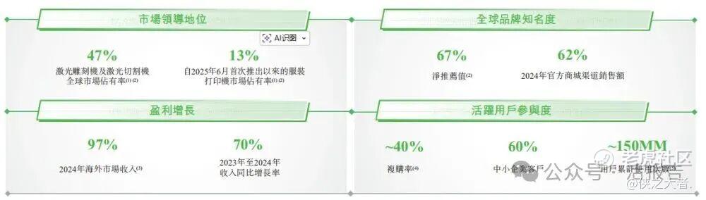 公司是全球第一的激光类个人创意工具品牌,于2025年前九个月按GMV计拥有37%的市场份额。公司亦是规模最大、增长最快的激光雕刻机及激光切割机品牌,于2025年前九个月按GMV计占47%的市场份额,是第二大品牌的六倍,并超越排名第二至第十的品牌之市场份额总和。
