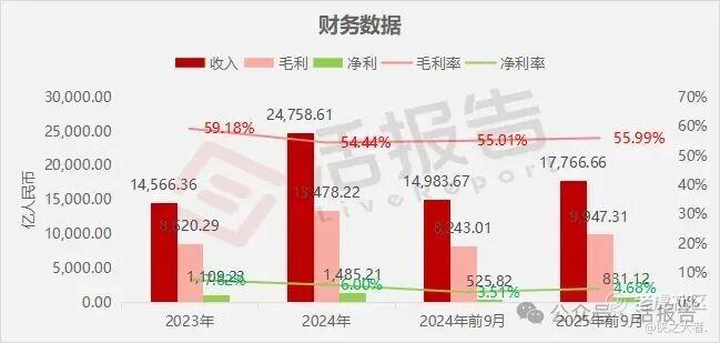 毛利分别约为人民币8.62亿、13.48亿、8.24亿、9.95亿,2025年前9月同比+20.68%;