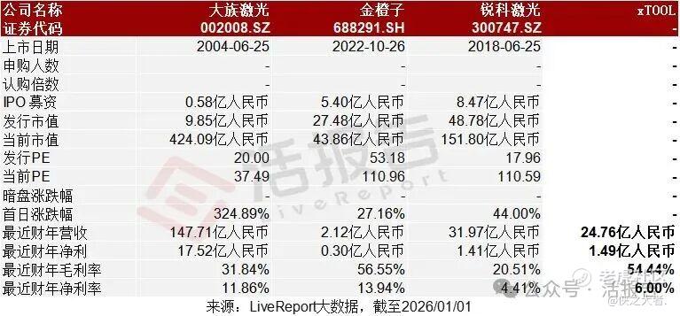 大族激光(002008.SZ)、金橙子(688291.SH)、锐科激光(300747.SZ)