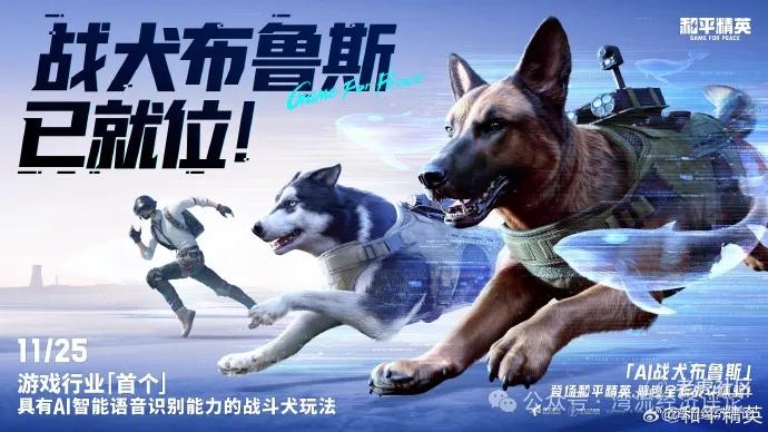 例如,腾讯游戏《和平精英》就推出了行业首个具备AI智能语音识别能力的AI战犬——布鲁斯。它不再是只会搜索天气和星座运势的电子宠物,而是可以在单局游戏中力挽狂澜的狠角色: