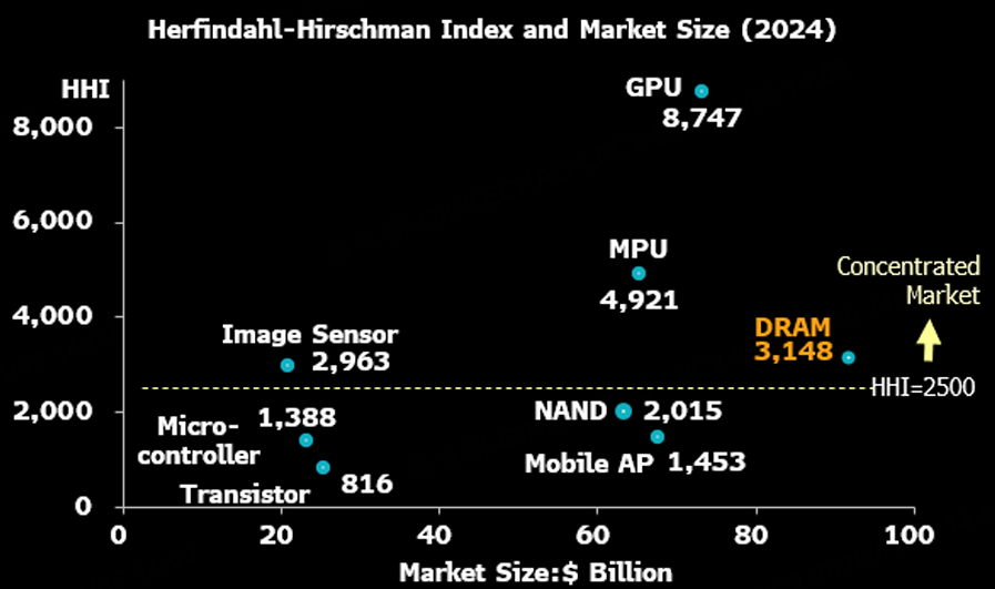 在存储领域,三星、SK海力士、美光三家公司占据了90%的市场份额,以衡量市场集中度的赫芬达尔-赫希曼指数(HHI)为例,DRAM达到了3148点,超过了代表寡头垄断的2500水平:
