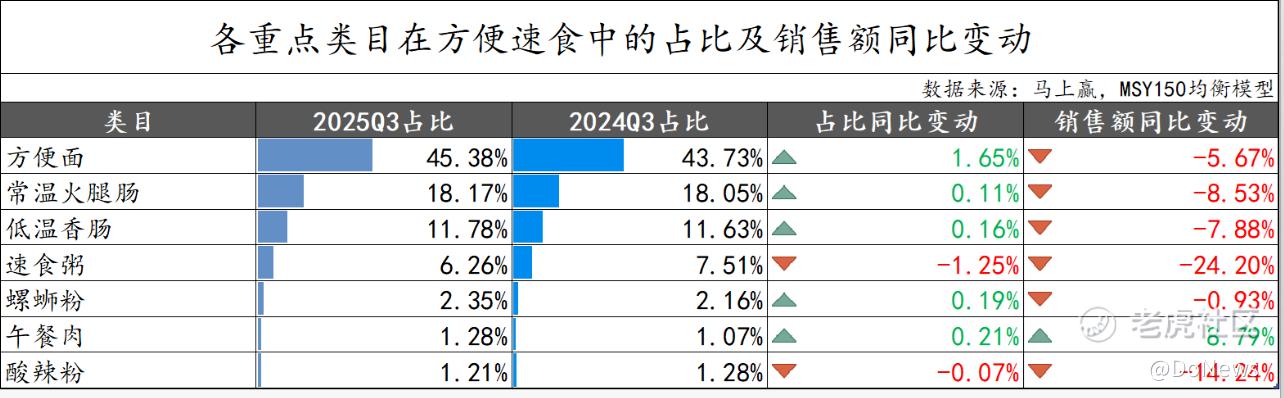 “品类分化”是2025年零食品类的核心特征,不同赛道呈现“冰火两重天”的态势。马上赢数据显示,速食品类中仅午餐肉实现占比与销售额双增长,其余品类均呈不同程度下滑,其中酸辣粉、速食粥销售额跌幅分别达14.24%、24.2%,下滑显著。