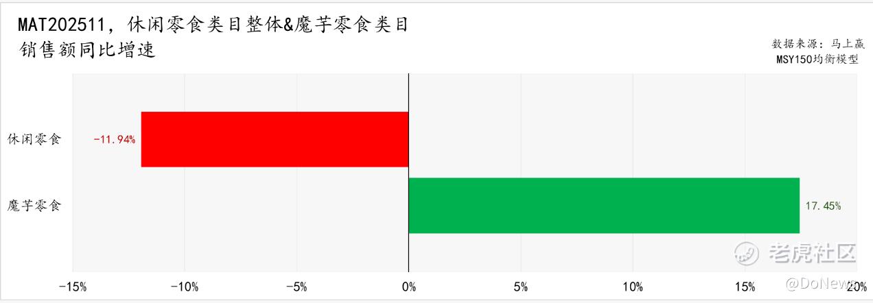 作为对比,健康化、功能化细分品类强势崛起。2024年12月至2025年11月,魔芋爽类目以17.45%的同比增速大幅领跑(行业整体同比-11.94%),成为休闲零食所有三级类目中销售额增速最高的赛道。