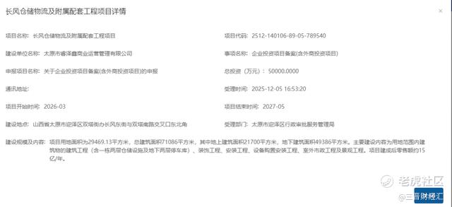 公示信息显示,该项目建设单位为太原市睿泽鑫商业运营管理有限公司,总投资5亿元,项目开始时间为2026年3月,2027年5月竣工。