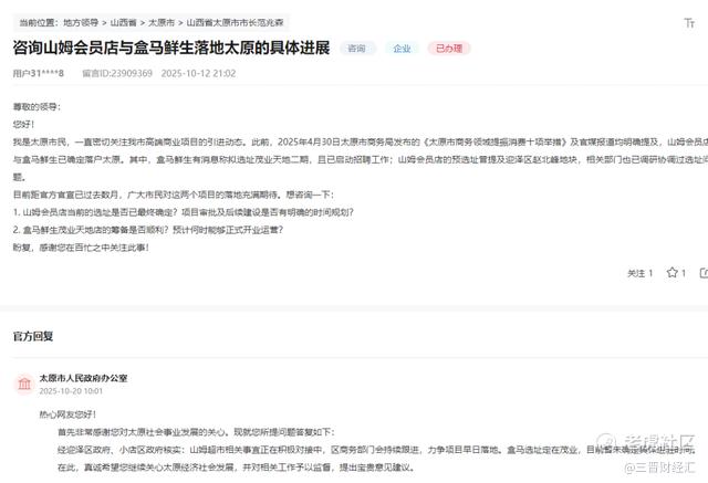 2025年10月,有太原市民在政府留言板询问:当前山姆会员的选址是否已最终确定?项目审批及后续建设是否有明确的时间规划?官方回复称:“山姆超市相关事宜正在积极对接中,区商务部门会持续跟进,力争项目早日落地。”
