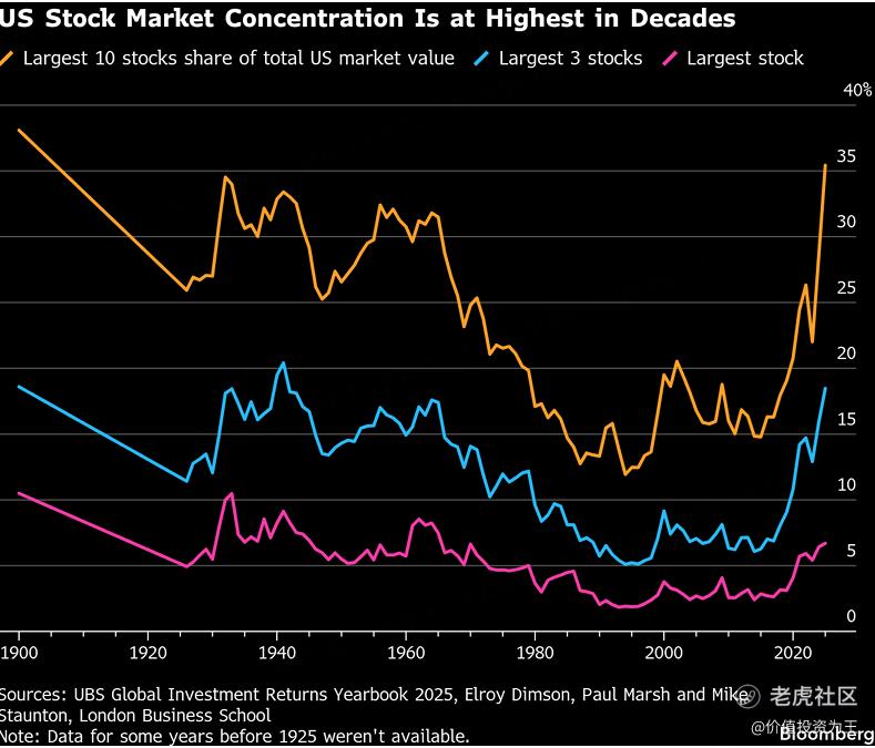 尽管目前的集中度比起前些年似乎过高,但并非没有先例。研究了过去125年全球资产回报的伦敦商学院教授PauI Marsh称,上世纪30年代和60年代,顶尖股票在美国股市中的占比也曾达到过类似的水平。Marsh说,1900年,美股总市值的63%与铁路股票相关,而到2024年底时,科技相关股票的比重为37%。 $标普500ETF(SPY)$ $Vanguard标普500ETF(VOO)$ $纳指100ETF(QQQ)$