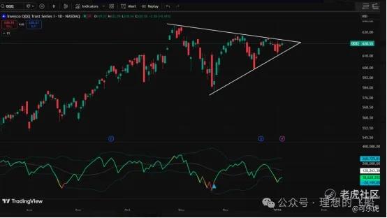 还有,QQQ的走势是很典型的挤压形态,我还是偏看多,QQQ一旦突破就有戏了。今晚就先解读这么多,大家有其它个股解读需求的可以私信我,晚安.