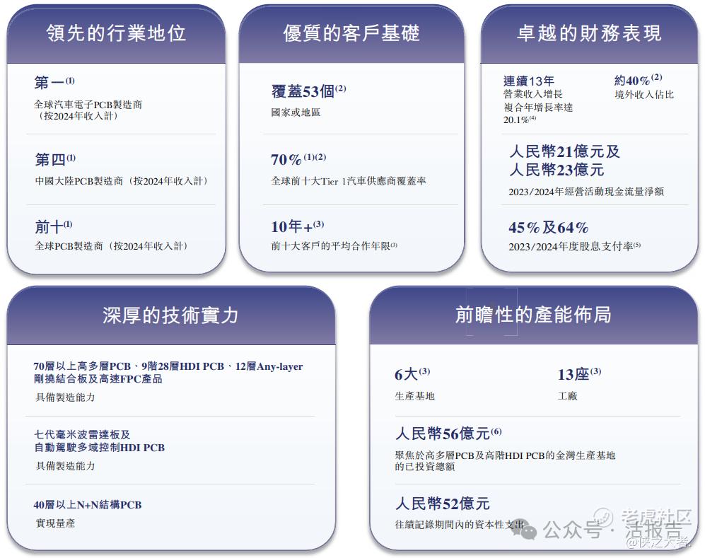 公司是以技术创新为驱动、以产品布局全面为特色的全球领先PCB产品制造商。公司的PCB产品为汽车电子、通信与数据基础设施、智能终端、工业控制等领域的全球客户提供智能互联基础。凭借高质量的PCB产品与先进的智造能力,公司已成为全球汽车电子PCB行业龙头及AI计算基础设施核心部件的少数供应商之一。
