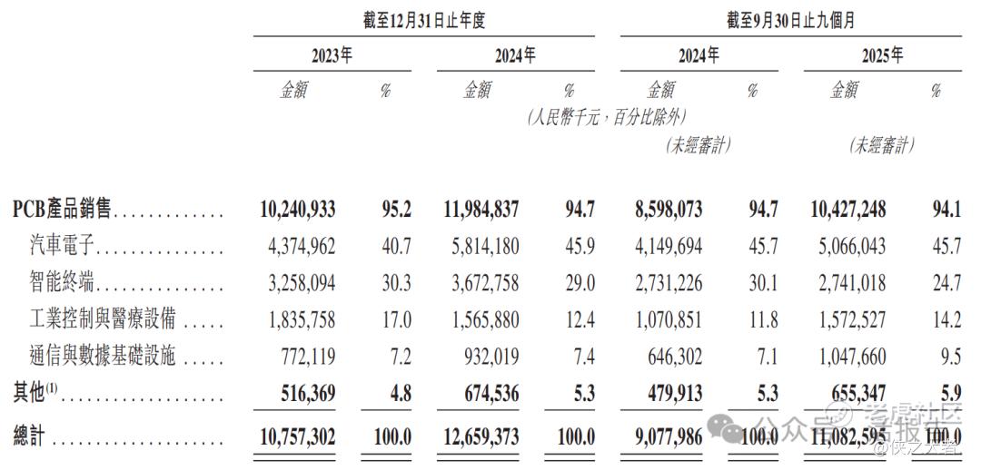 公司收入主要来自PCB产品销售,2023年和2024年该业务占总营收比例均超94%,重大部分来自汽车电子和智能终端领域,2024年两者合计占比74.9%,其中汽车电子业务占比达45.9%,是核心收入支撑;通信与数据基础设施领域收入占比相对较小,2024年为7.4%;含铜生产残余物销售等其他业务获得的收入比例最小,2024年占比5.3%。