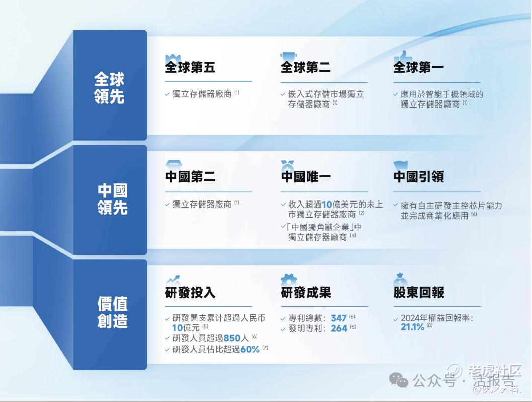 全球领先:根据弗若斯特沙利文的资料,按2024年收入计,公司是全球第五大、中国内地第二大独立存储器厂商。基于公司对客户需求的洞察,公司搭建了全栈式平台,覆盖(i)主控芯片设计与开发,(ii)固件算法开发,(iii)测试系统开发及(iv)存储介质特性分析四大核心技术。