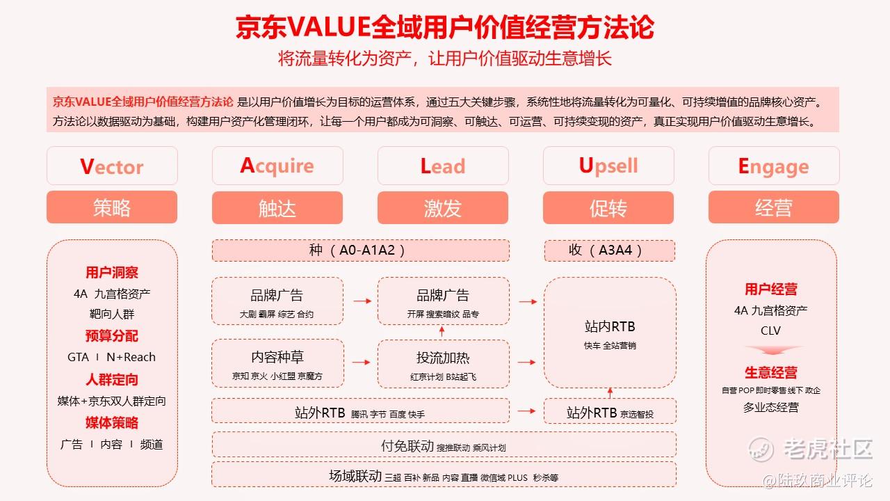 针对以上痛点,京东VALUE全域用户价值经营方法论以用户价值增长为目标的运营体系,通过五大关键步骤(V策略-A触达-L激发-U转化-E经营),系统性地将流量转化为可量化、可持续增值的品牌核心资产。帮助商家通过打通站内站外资源,实现 “广触达 - 深种草 - 强转化 - 长效经营” 的闭环。依托数智工具,让营销决策更科学、资源分配更高效。