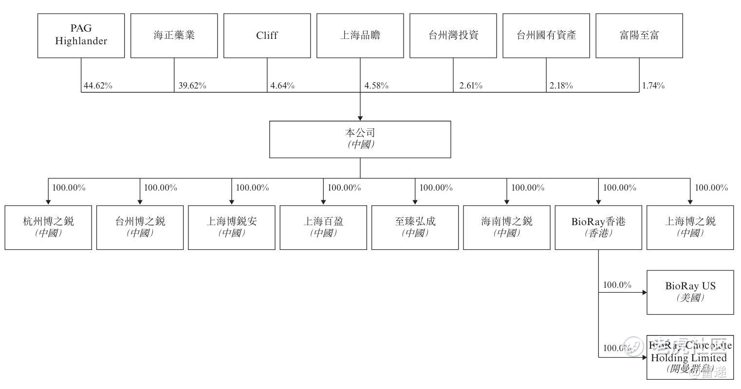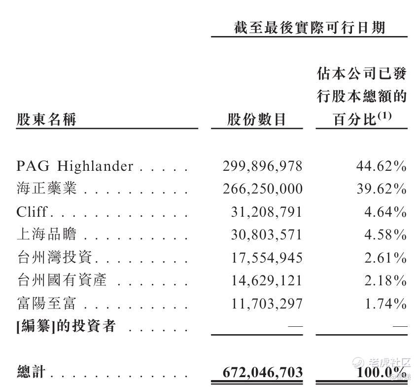 IPO前,PAG Highlander持股为44.62%,海正药业持股为39.62%,Cliff持股为4.64%,上海品瞻持股为4.58%,台州湾投资持股为2.61%,台州国有资产持股为2.18%,富阳至富持股为1.74%。