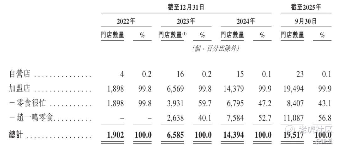 截至2025年9月30日,鸣鸣很忙有零食很忙门店8,407家,占比为43.1%;来自赵一鸣零售的门店数为11,087家,占比为56.8%。