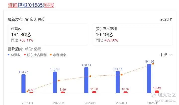 期内,雅迪总营收191.86亿元,同比大涨33.11%,股东应占溢利16.49亿元,同比暴涨59.50%,若加上第三季度的数据,雅迪应是当之无愧的行业第一;