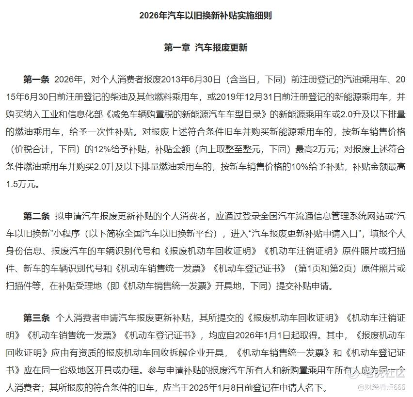 2026年汽车以旧换新补贴细则正式敲定!商务部等8部门于2025年12月31日印发实施细则,自今年1月1日起正式执行。国补不仅得以延续落地,补贴规则更迎来关键性调整,这一变动或将深刻影响全年车市走向,甚至重塑产业竞争格局。