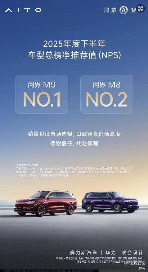 近日,杰兰路发布《2025年度下半年新能源汽车品牌健康度研究》报告。作为衡量用户推荐意愿的重要指标,品牌净推荐值(NPS)车型总榜备受关注。榜单显示,问界“双旗舰王牌”再添佳绩:全景智慧旗舰SUV问界M9位居车型NPS(净推荐值)第一,家庭智慧旗舰SUV问界M8首次参评即位居NPS(净推荐值)第二。该结果进一步印证了问界在高端新能源市场的用户口碑表现。