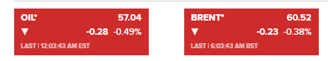 WTI原油:-0.28美元(-0.49%)至57.04美元/桶