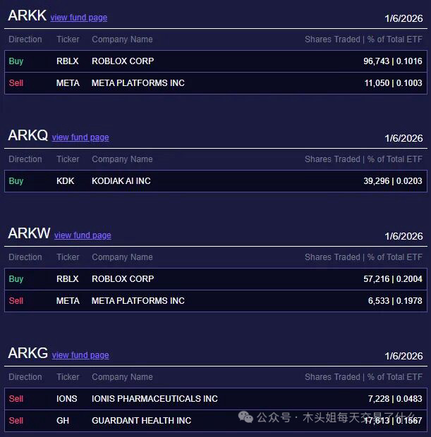 木头姐今天抄底买入1300万美元RBLX 卖出1300万美元脸书