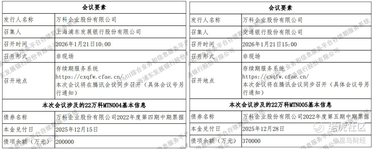 根据1月7日晚间公告,两笔中票最新的持有人会议已确定时间。其中,“22万科MTN004”将于1月21日上午10点再次召开持有人会议;“22万科MTN005”持有人会议则于1月21日下午3点召开。