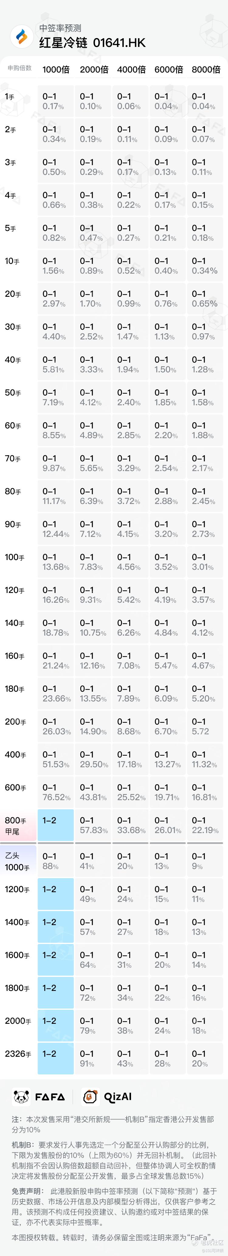 红星冷链采用机制B,回拨10%;全球发售2326.30股,香港发售232.65万股,一手是500股,共计4653手,全员抽奖;甲尾申购需要49万本金,乙头申购需要62万本金;豪威集团、红星冷链、兆易创新、BBSB INTL这4个新股存在资金冲突,只能挑着打;现在倍数是15倍了,等上一批资金释放后,预计最终会在3000倍左右;由建银和农银联合保荐,有基石,无绿鞋,历史保荐项目还可以。