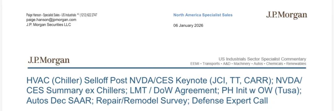 JPM于1月6日发布工业板块晨报,核心爆点来自Jensen Huang的CES主题演讲——他直接宣称下一代架构在45°C环境下"no water chillers are necessary"。