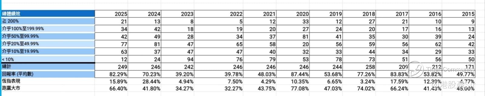 而在绩效分布方面,先看表现较差股份,于分析后升幅少于一成的有12只,占246只的4.88%,继2024年的24只再创新低。其中8只更是在2025年12月选出,时长少于一个月,与分析功力强弱无关。当然,取得佳绩有市况配合功不可没;但相信2026年选上表现逊色股份会有所增加,尽量争取维持占比不多于15%。从2025年表现较差股份占比继续少于一成来看,可见笔者选股策略仍以低损手风险作主导,间接反映以此策略在2024和2025年均取得不俗投资表现。