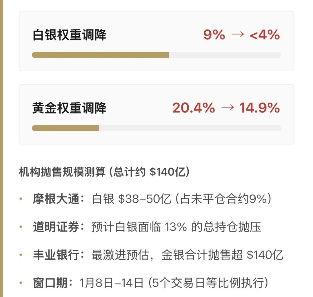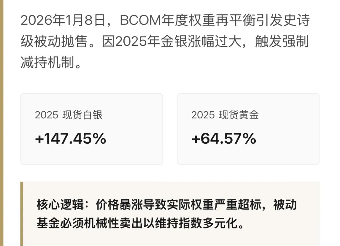 彭博商品指数(BCOM)年度权重再平衡于1月8日正式启动,因2025年金银分别暴涨64.57%和147.45%导致权重严重超标,追踪该指数的被动型基金将在未来五个交易日内集中执行大规模减持。