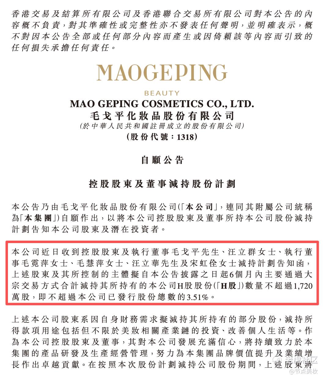 1月6日晚,港股“国货高端美妆第一股”毛戈平(01318.HK)一则减持公告激起千层浪。