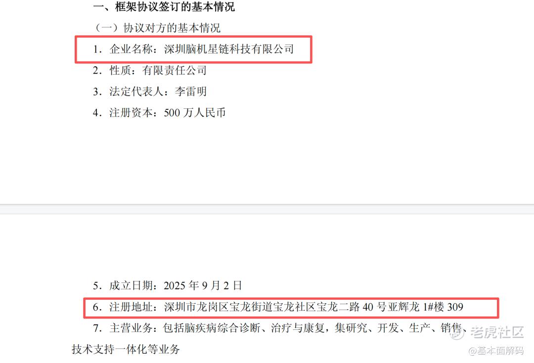 公告显示,脑机星链成立于2025年9月2日。这意味着截至协议签署日(2026年1月6日),该公司仅存续了约4个月。更为关键的是,其注册资本仅为500万元人民币。