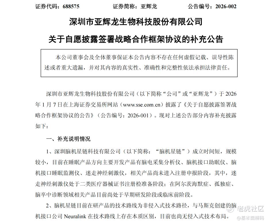 深圳市亚辉龙生物科技股份有限公司(以下简称“亚辉龙”)于2026年1月6日及7日公告《关于自愿披露签署战略合作框架协议的公告》、《关于自愿披露签署战略合作框架协议的补充公告》以及《关于收到上海证券交易所问询函的公告》。基本面研究员对亚辉龙与深圳脑机星链科技有限公司(以下简称“脑机星链”)的合作事项进行“穿透式”分析。