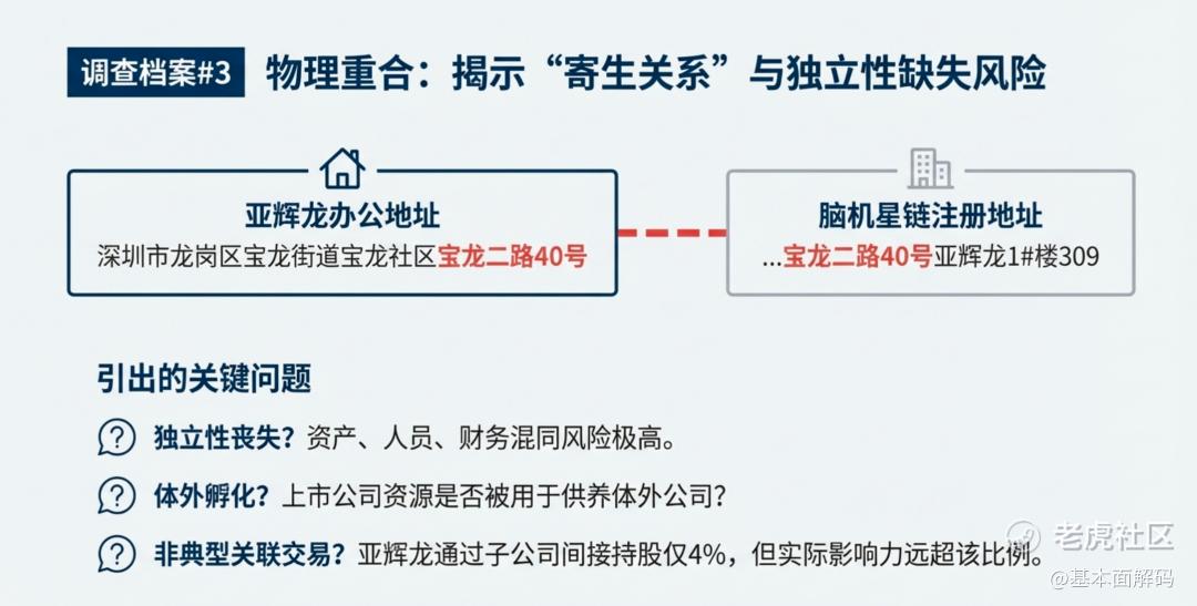 是否独立性丧失?在这种物理重合下,人员、资产、财务的混同风险极高。脑机星链的员工是否持有亚辉龙的工牌?其水电网络是否由上市公司承担?如果答案是肯定的,那么亚辉龙实际上是在用上市公司的资源(股东的钱)供养一个体外公司。