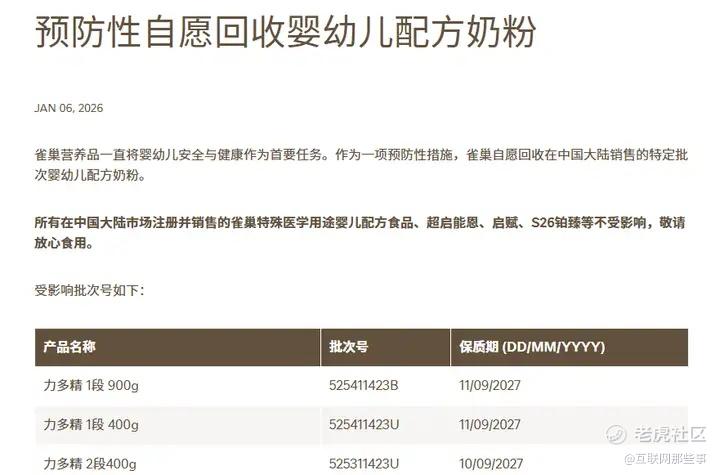 在这样的背景下,1月5日晚间,雀巢开始在德国、奥地利、丹麦、意大利等欧洲国家自愿召回奶粉。后在1月6日,雀巢发布公告“预防性自愿回收婴幼儿配方奶粉”,开始在中国召回力多精、铂初能恩、舒宜能恩等婴幼儿奶粉。