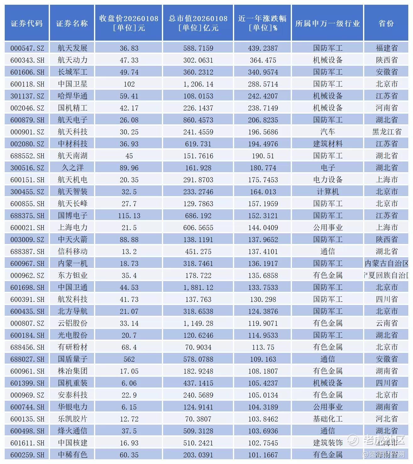 从二级市场表现看,截至1月8日收盘,近一年,已诞生35只翻倍股。 $航天发展(000547)$ 、航天动力(600343.SH)、 $长城军工(601606)$ 、 $中国卫星(600118)$ 、哈焊华通(301137.SZ)、国机精工(002046.SZ)、航天电子(600879.SH)等7家公司涨幅均超过200%。