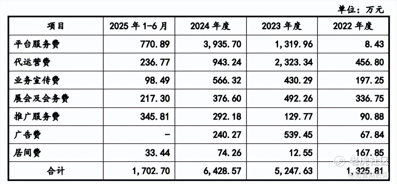 其中,平台服务费在2022年只有8.43万元,2023年直接飙升至1319.96万元,2024年再度升至3935.70万元;代运营费用2022年为456.80万元,2023年增至2323.34万元;广告费2022年为67.84万元,2023年则增至539.45万元。
