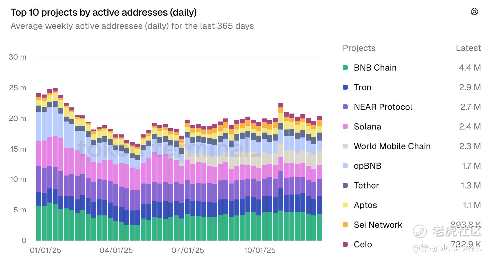 效果也显而易见,稳定币交易、DEX 交互、链上转账等高频行为快速增长,BNB Chain 在多个时间窗口内成为日活跃地址数最高的公链之一。Token Terminal 最新数据显示,BNB Chain 日活达到了 440 万,位列区块链榜首。2025 年链上日均交易笔数稳定在千万级,并在 10 月创下单日 3,100 万笔交易的历史新高,峰值同比增长 150%。与此同时,TVL 同比增长 40.5%,稳定币市值在链上实现翻倍,峰值达到 140 亿美元。