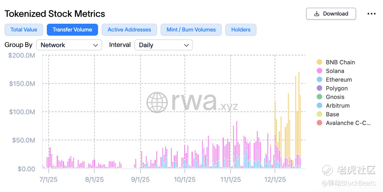 当 Ondo Global Markets 宣布将 100+ 美股和 ETF 引入 BNB Chain,并深度集成进 Binance Wallet 后,市场发生了剧烈的化学反应。得益于 BNB Chain 庞大的日活用户,Ondo 的代币化股票交易量从此前的单日峰值 8,400 万美元暴涨至 1.7 亿美元。