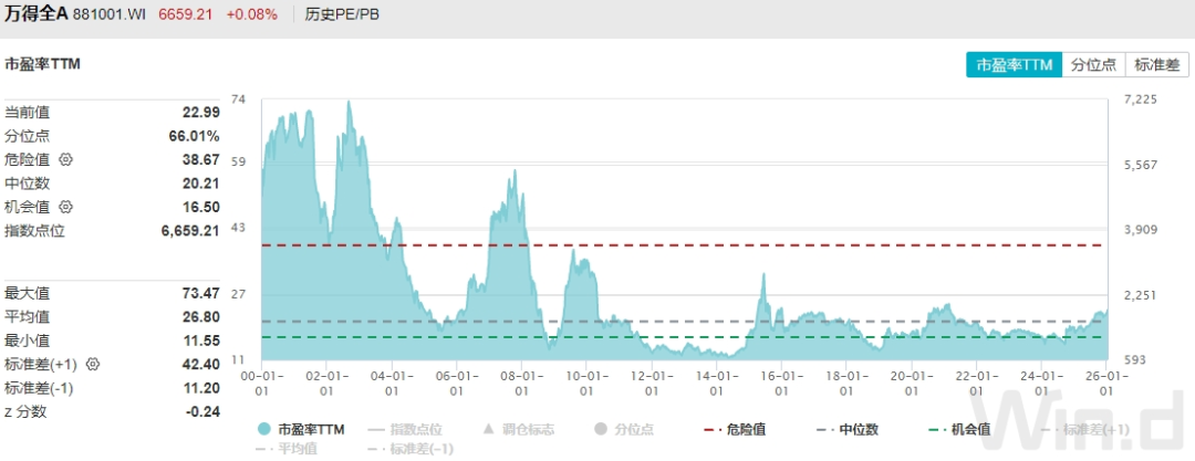 目前万得全A指数市盈率是17.79(数据截止到2026年1月8日收盘,下面各项数据也是截止到此日期),A股市场的总体估值,仍然是相当低估的。