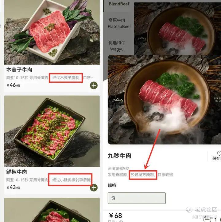 山系火锅主打的“自然健康”形象,与高比例的腌制肉菜单现实形成对立。九秒牛肉、香菜牛肉、辣椒牛肉……菜单小字都有“秘方腌制”字样。