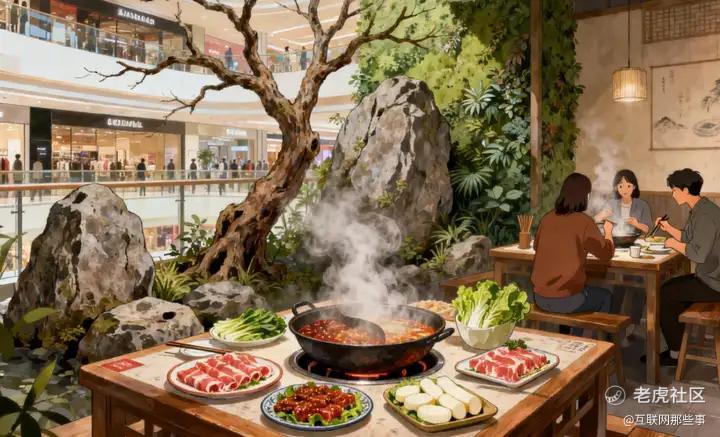 都市人向往自然,枯树枝、假山石、绿植墙构成的山野火锅仿佛成了临时平替。