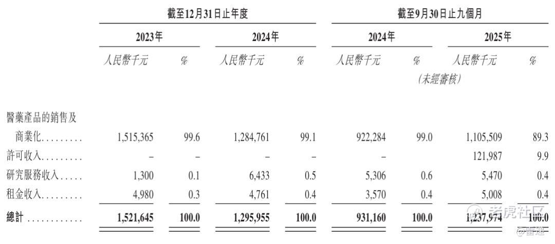 先声再明医药2025年前9个月医药产品的销售及商业化收入为11亿元,占比为89.3%;许可收入为1.22亿元,占比为9.9%。